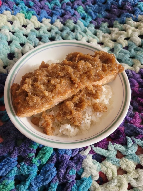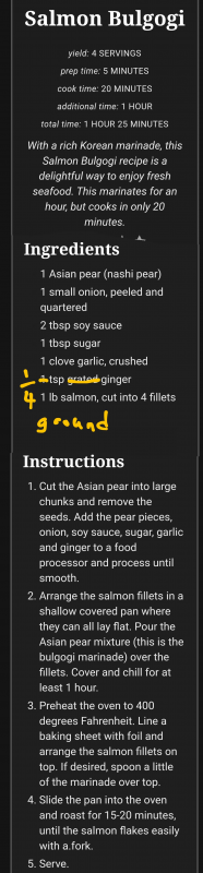 I got some discounted Asian pears and needed to use them. Doubled the recipe since we had 2lbs salmon. Pretty light and tasty, would probably be better leaving the salmon to marinate longer. Also left the salmon skin on b/c yum. There was plenty of marinade left, cooked it down to kill any uncooked salmon left in it, and will jar/save it for later. Could use some sauteed greens with it.