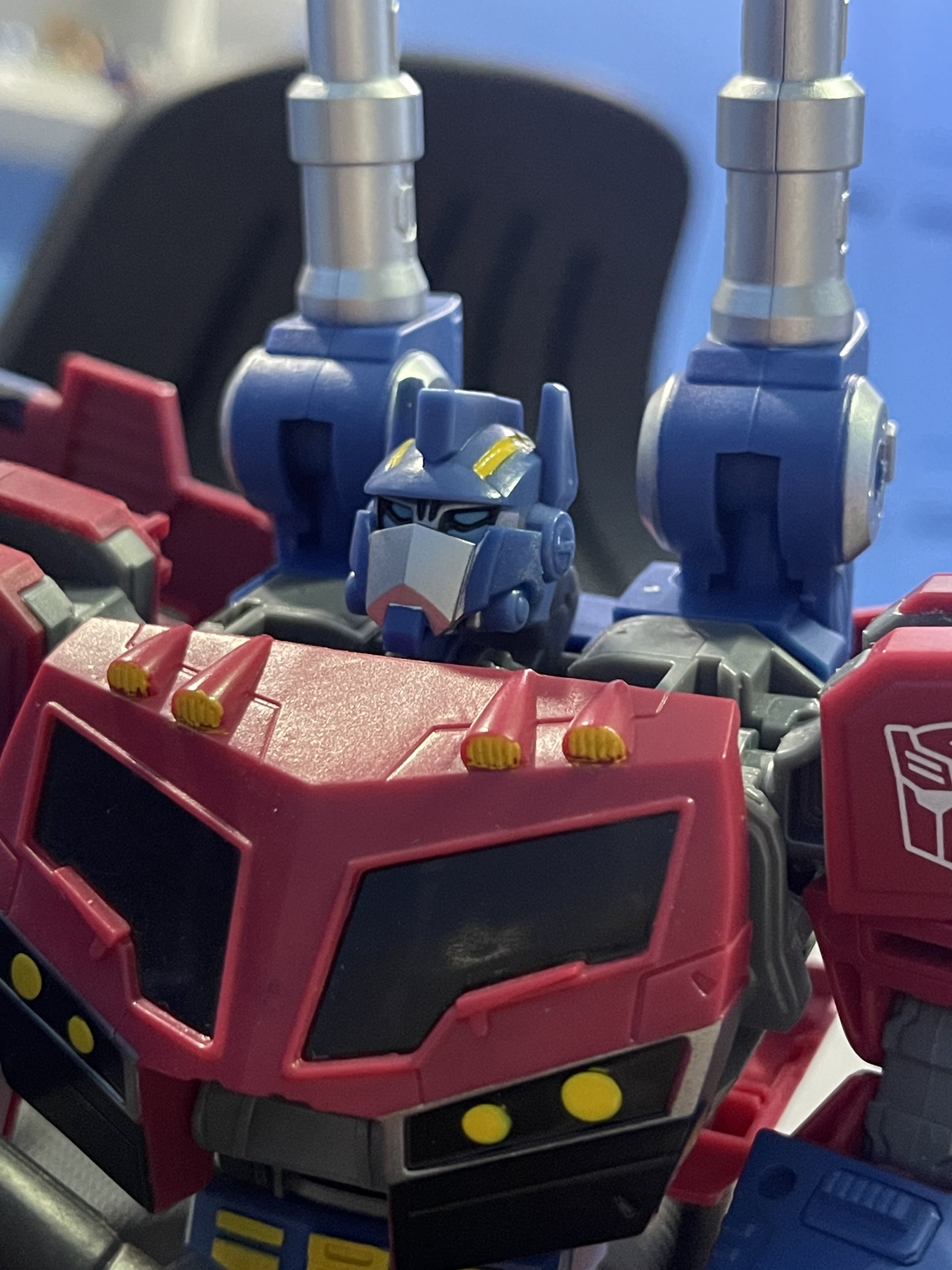 Vehicle mode is the complete fire truck occasionally seen in Animated. New wheels roll and it holds together well. Kinda annoying that the wheel attachment doesn’t match Optimus but eh.There is a minor clearance problem with the front of the trailer and a tab on the truck mode but it just means that the truck and trailer don’t sit 100% flush. I cut the tab since it doesn’t really affect anything in truck or robot mode but modification is not strictly necessary. It looks good from all angles and has multiple 5mm ports all over. No dedicated axe storage though. The trailer contains and requires the boots, gauntlets, wings and hammer for structural integrity. When put together, it’s solid as a rock