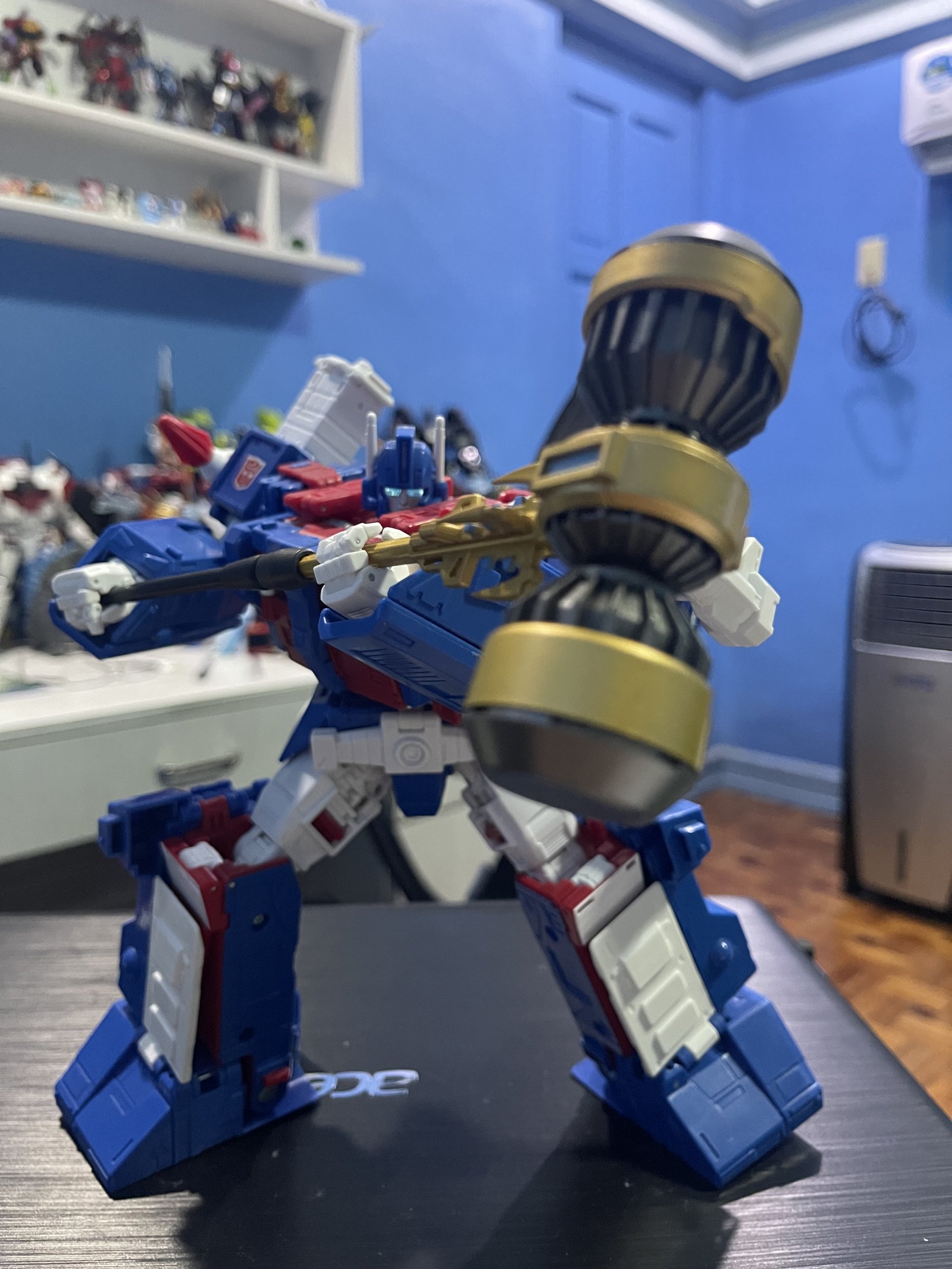 Prime’s articulation isn’t impeded at all but the short thighs and long shins can limit posing. Also the gauntlets make two handed hammer poses tricky. Apart from the shoulder guns, the ladder can be held as a Cybertron-esque cannon.