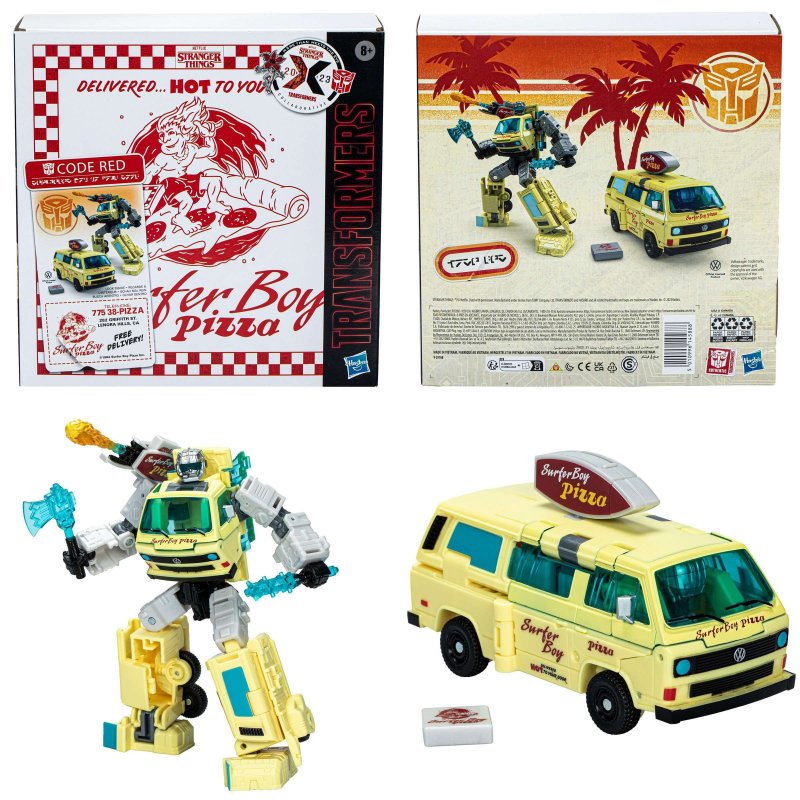 The worlds of Transformers robots and Stranger Things collide with the Stranger Things x Transformers Code Red mash-up pack! Transformers robots have always been More Than Meets the Eye. Now fans can experience Transformers characters as they mash-up with iconic characters who share this same quality. As seen in the Netflix series, Stranger Things, Code Red 6.5-inch figure converts from robot to Surfer Boy pizza van mode in 16 steps, featuring screen-accurate deco and details. You can count on Code Red to deliver your food – or firepower – in 30 minutes or less.